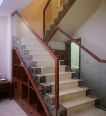玻璃栏杆的玻璃和扶手均收在楼梯低口