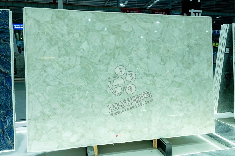 其颜色以浅灰、米白为基底,纹理处带有淡淡的青灰色调,不同 “晶体块” 之间的色泽过渡柔和,整体质感晶莹通透,光线照射下能呈现出细腻的光泽变化,仿佛蕴藏着细碎的光感,既具天然石材的肌理感,又有类似水晶的清透质感,视觉上精致且富有轻奢感。