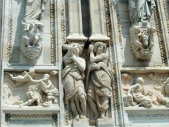 意大利米兰大教堂是欧洲中世纪最大的教堂,可供4万人举行宗教活动。它始建于公元1386年,到公元1485年才完成。雕刻和尖塔是哥特式建筑的特点之一,米兰大教堂可以说是把这个特点淋漓尽致的表现出来了。教堂顶部建有135座哥特式大理石尖塔,每一塔顶立有塑像,另有150个水道,410个大理石支架,上面均装饰有浮雕。尖塔之林直立挺拔,给人以飞腾升华、超脱尘世之感 。米兰大教堂也是世界上雕像最多的哥特式教堂。整座教堂共有大理石雕像6000多座,3159座位于建筑外部,其中2245尊是外侧雕刻,雕像的主题多为圣经故事等宗教题材,各种雕像千姿百态,每个雕塑都有一个自己的故事。教堂内部也全由白色大理石筑成。厅内全靠两边的侧窗采光,窗细而长,上嵌彩色玻璃,光线幽暗而神秘,地面是用大理石铺成的马赛克图案。在所有柱子的柱头上都有小龛,内置雕像,手工精美。顶四周刻有8座石像穹隆,殿内的雕像有800多座。