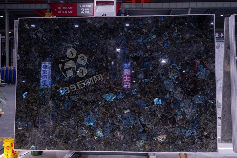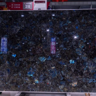 蓝翡翠奢石大板的纹理极具震撼力:以深邃的黑色为基底,其上布满大小不一、形状不规则的蓝绿色晶体碎片,这些晶体如同散落的宝石,相互交织、错落分布,呈现出随性却极具艺术感的乱纹效果。晶体自带虹彩效应,在光线照射下,会折射出从浅蓝到深蓝,甚至泛着紫调的斑斓光泽,仿佛将星空的深邃与宝石的璀璨浓缩于板面之上。黑色基底与蓝绿色晶体的强烈对比,加之晶体的虹彩变化,让纹理充满了动态的奢华感,每一处细节都似天然的艺术创作,稀缺且极具视觉冲击力。