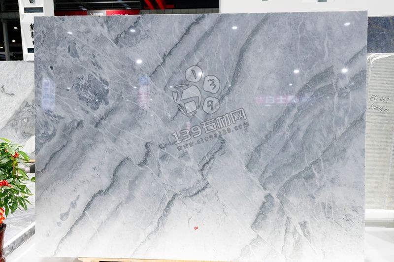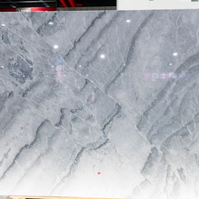 这不是典型的宝格丽大理石,而是一款灰色系大理石。其纹理以浅灰为基底,深灰色纹理呈大尺度的流动状分布,如同山峦的轮廓线,纹理走向富有韵律感,整体呈现出大气磅礴的山水画卷效果,给人一种沉稳且具艺术感的视觉体验。