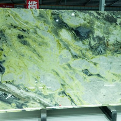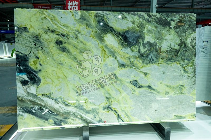 绿野仙踪奢石的纹理极具自然奇幻感:以黄绿、灰绿为主色调,交织着深灰、墨黑的色块,形成丰富的色彩层次。纹理呈现出类似 “水墨晕染 + 矿物晶体交织” 的效果,无固定走向,如云雾在林间流动、溪流在石间穿梭,随性却和谐。浅绿如春日新叶,深绿似浓荫翠色,墨黑斑块如山石肌理,色块过渡自然,仿佛将 “绿野仙踪” 的奇幻森林场景凝固于板面,每一处纹理都是天然的艺术创作,充满野性与雅致的融合感,视觉层次极为丰富且富有冲击力。